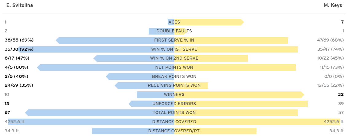 Возможно, в плане подачи стартовая партия стала лучшей в карьере Свитолиной (небольшой спойлер: во второй было то же самое). Только вдумайтесь в эти космические цифры: % первой подачи составил 79, на ней же выиграно 21 очко из 23 возможных. Да и на второй добыто 3 из 6 - отличный показатель. Всего 5 проигранных очков за 6 геймов – фантастика! Чего только не сделаешь на 33-летие своего возлюбленного.