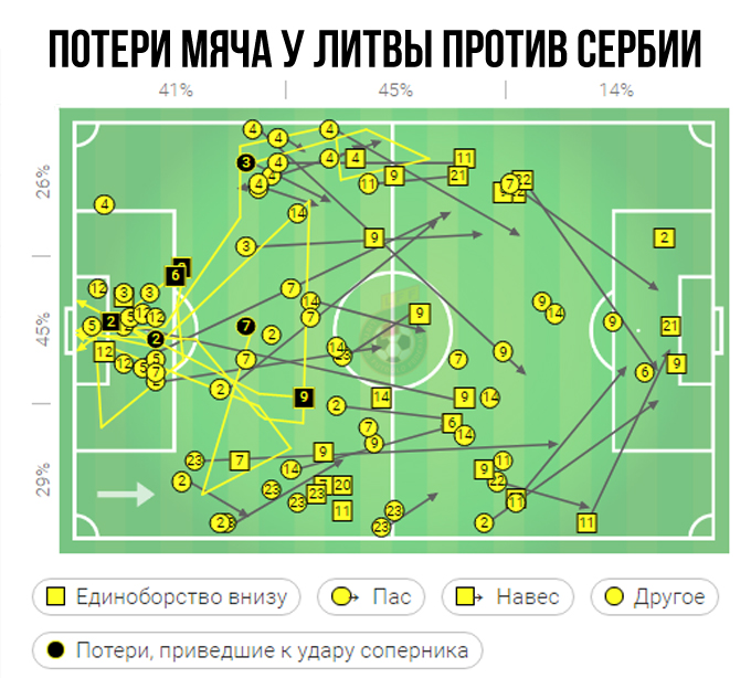 Важно отметить, что сербы очень хорошо прессинговали оппонента по ходу всего поединка. Индекс PPDA у балканцев составил 4,7, в то время как у литовцев он был равен очень неприглядным 23,8. За счет серьезного прессинга Сербия заставляла соперника очень много ошибаться на флангах, а особенно – в центре штрафной, где у Литвы произошла бо̀льшая часть потерь из всех, что случились в первой трети поля.