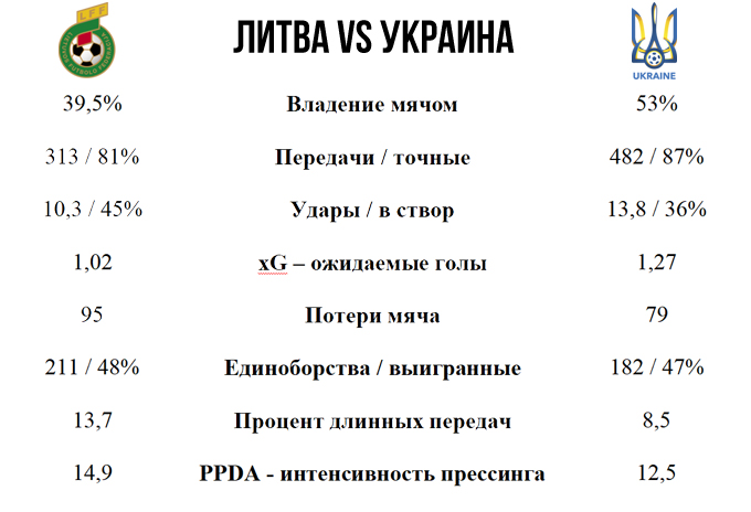 Главным различием между нынешними сборными Литвы и Украины является то, что команда Андрея Шевченко старается вести игру сама, а вот подопечные Валдаса Урбонаса более склонны приспосабливаться к действиям соперника, предпочитая «плясать от печки». Все это сказывается на ключевой статистике, которую команды демонстрируют в нынешнем отборочном цикле на чемпионат Европы-2020.