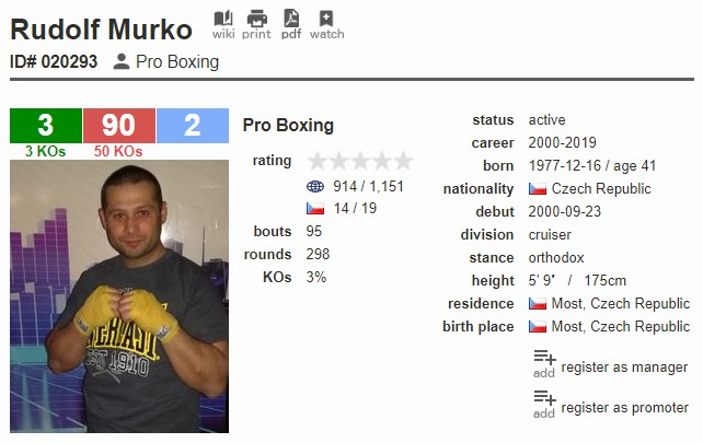 Рудольф Мурко из Чехии! Вы эту фамилию не слышали раньше и не услышите впредь. Про него не напишут британские таблоиды. Его не покажут на ESPN. Майкл Баффер не скажет на его боях свою знаменитую фразу «Let’s get ready to rumble!»
