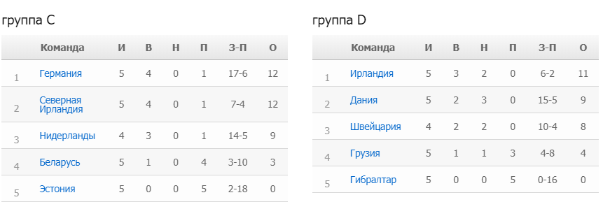 В этой группе сразу четыре команды имеют шансы попасть на Евро. Пока что лидируют сборные Германии и Северной Ирландии, однако шансы идущей на третьей позиции Голландии ничуть не ниже – они просто провели на игру меньше. Уже в следующем туре команда Кумана может догнать и перегнать британцев – в очном домашнем матче. Северным ирландцам предстоит еще и выезд в гости к Бундестим, так что команда вряд ли удержится в двойке. А вот Беларусь, которая конкурирует с Эстонией в борьбе за «почетное» четвертое место, обязательно получит свой шанс на Евро в стыковых поединках.