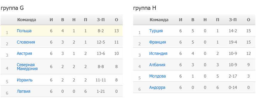И здесь все непросто. На верхушке – французы и турки, у которых по 15 баллов, у исландцев на три меньше, идущая четвертой Албания тоже имеет шансы. Многое, если не все в этой группе, решится в октябрьской спарке. Там сразу несколько лобовых поединков. По итогам Лиги наций ни одна из команд этой группы не заработала прямой путевки в плей-офф.
