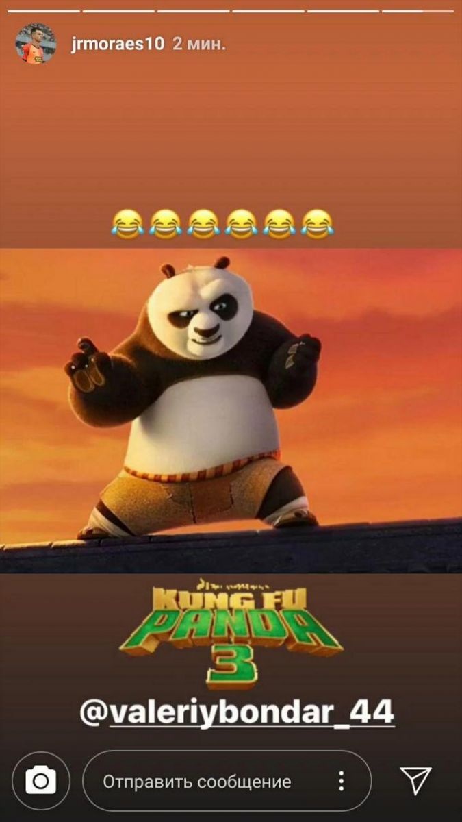 В поединке против «Зари» U-21 (3:0) Бондарь получил фингал. Это не укрылось от внимания Мораеса, который в Instagram сравнил Бондаря с главным героем мультфильма «Кунг-фу панда 3» — пандой По.