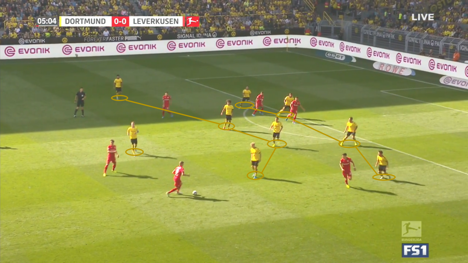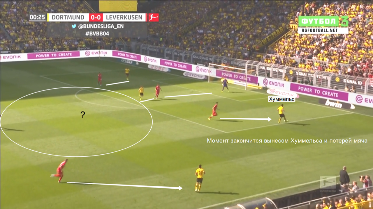 Таким приемом «Боруссия» должна была отрезать минимум 5 игроков «Байера», которые участвуют в активном прессинге. Но в этом моменте игроки «Байера» перехватили передачу Ройса на Ашрафа.