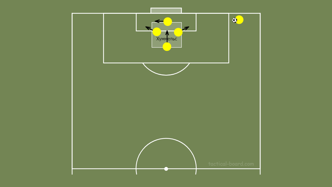 Матс — уже ключевой игрок в системе игры Фавра. Во-первых, его первый пас используется на 100%. Во-вторых, он становится главным оружием при стандартах. Фавр придумал очень простой и классный розыгрыш. При таком штрафном 3 игрока «Боруссии» разбегаются на ближнюю и дальнюю штангу, освобождая пространство для Хуммельса. Пока минусом можно считать то, что в центральной зоне остается только Матс, и перехватить передачу для соперника проще, так как он не отвлекается на соперника.