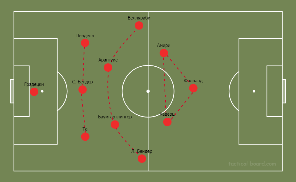 Начинали атаку подопечные Боса по схеме 3-2. Уже освоился на необычной позиции Венделл, который играет на средней позиции между левым и центральным. Во второй линии находились два опорника — Арангуис и Баумгартлингер.