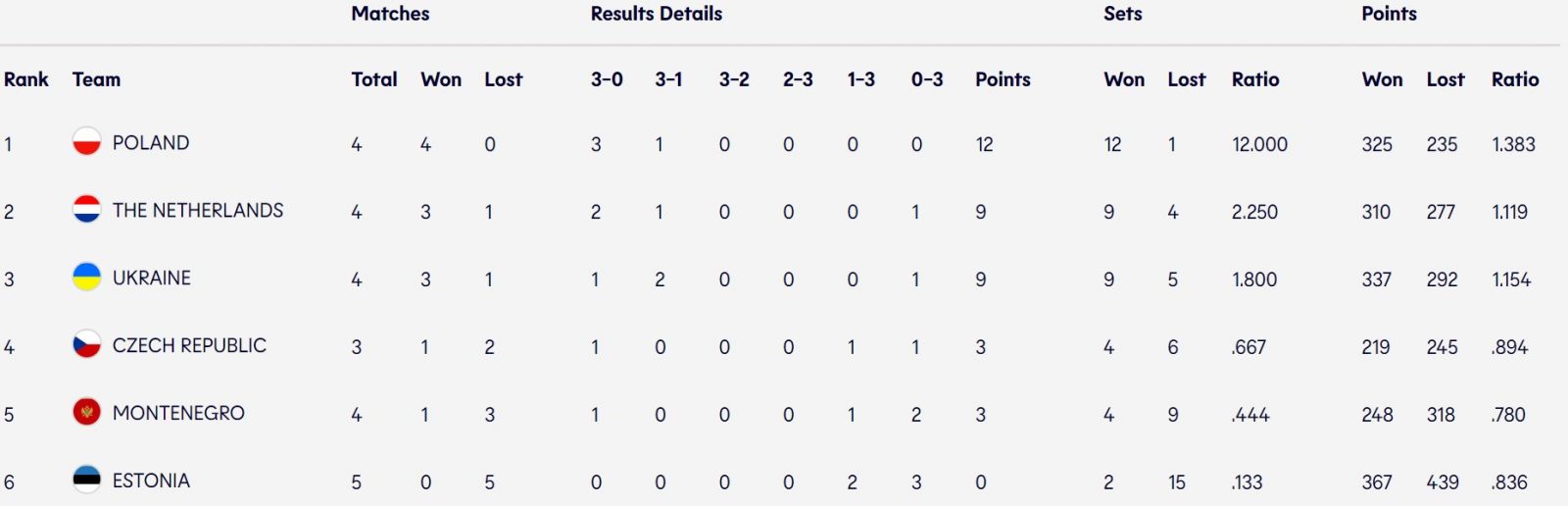 Ну що ж Нідерланди програли в 5 сетах тому Чехія набрала лише 2 очка - тепер Україна точно залишиться на 3 місці - а якщо виграє з Польщею навіть з рахунком 3-2 то вийде на друге місце. Цікаво що буде в разі програшу 2-3 - ми зрівняєиося з Нідерландами за пунктами - ми їм програли але потрібно читати правила - можливо враховують якісь додаткові очки...
