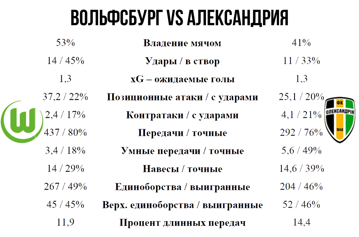 В завершении, чтобы лучше представлять себе соперника нашей команды, а также понимать ключевые различия в игре между «Вольфсбургом» и «Александрией», предлагаем ознакомиться с ключевыми статистическими показателями обеих команд в официальных матчах нынешнего сезона.