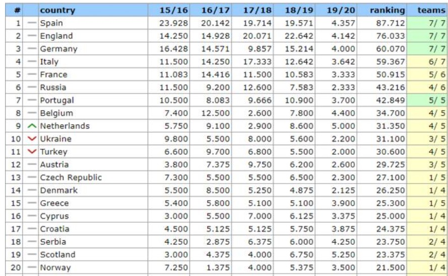 В итоге имеем на сегодняшний день позиции на следующий сезон (только команды с 10 по 16 место в рейтинге) у стран выше отрыв огромный: