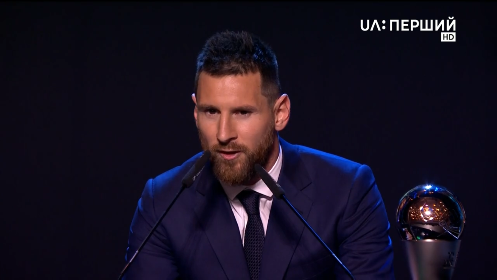 22:58. Это для него 6-я награда лучшему футболисту по версии ФИФА. Выступает Лионель Месси на испанском языке.