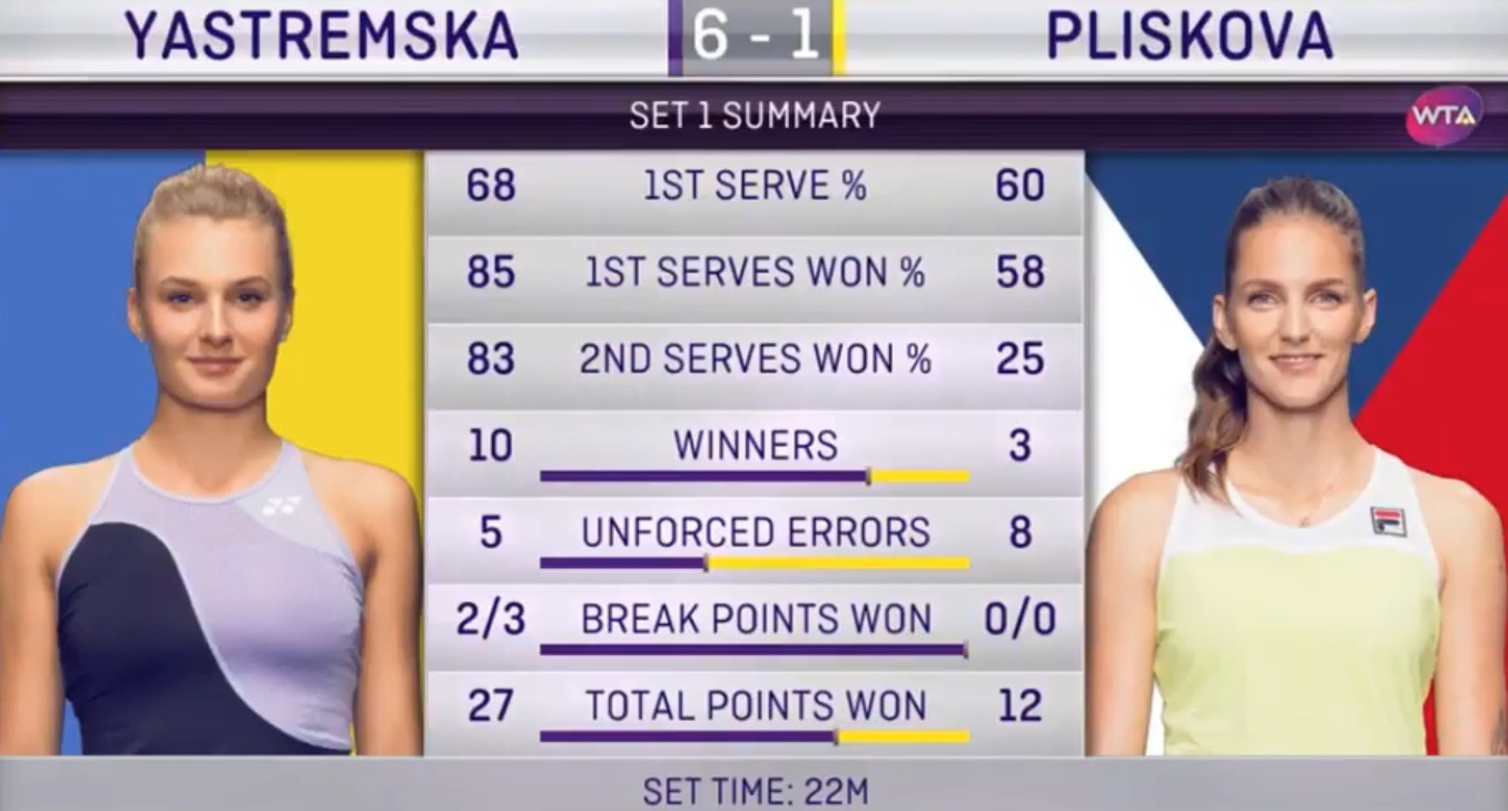 Первый сет превратился в театр одного актера. Плишкова явно не была готова к тому, что у Ястремской сегодня практически все удары полетят в корт, и спустя всего 22 минуты «королева эйсов» вынуждена была думать над тем, как играть уже во второй партии.