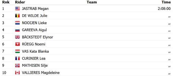 Американка Меган Джестреб стала чемпионкой мира среди юниорок (до 19 лет) в групповой гонке. Она опередила Юли Де Вильде из Бельгии и голландку Лике Ноойен.