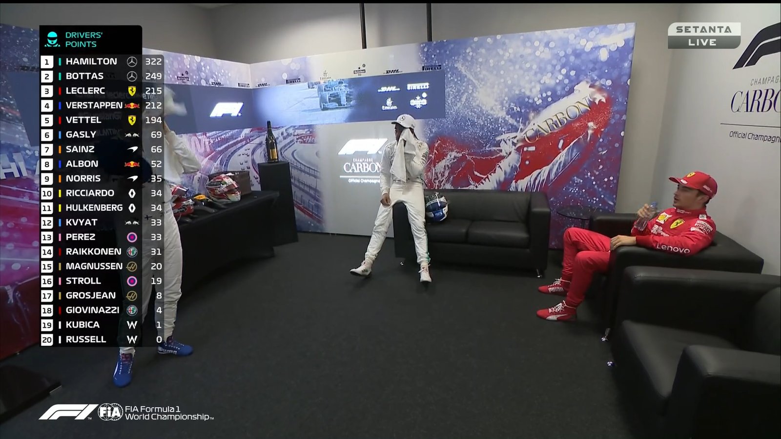 15:49. Генеральная классификация чемпионата: Хэмилтон – 322, Боттас – 249, Леклер – 215.