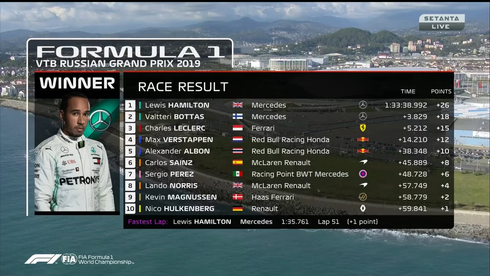 15:48. Итог гонки: Хэмилтон – Боттас – Леклер – Ферстаппен – Албон.