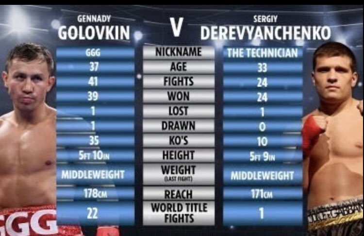В ночь с 5 на 6 октября на арене спортивного комплекса Madison Square Garden в Нью-Йорке пройдет титульный бой в среднем весе между Геннадием Головкиным (39–1–1, 35 KO) из Казахстана и украинцем Сергеем Деревянченко (13–1, 10 KO).