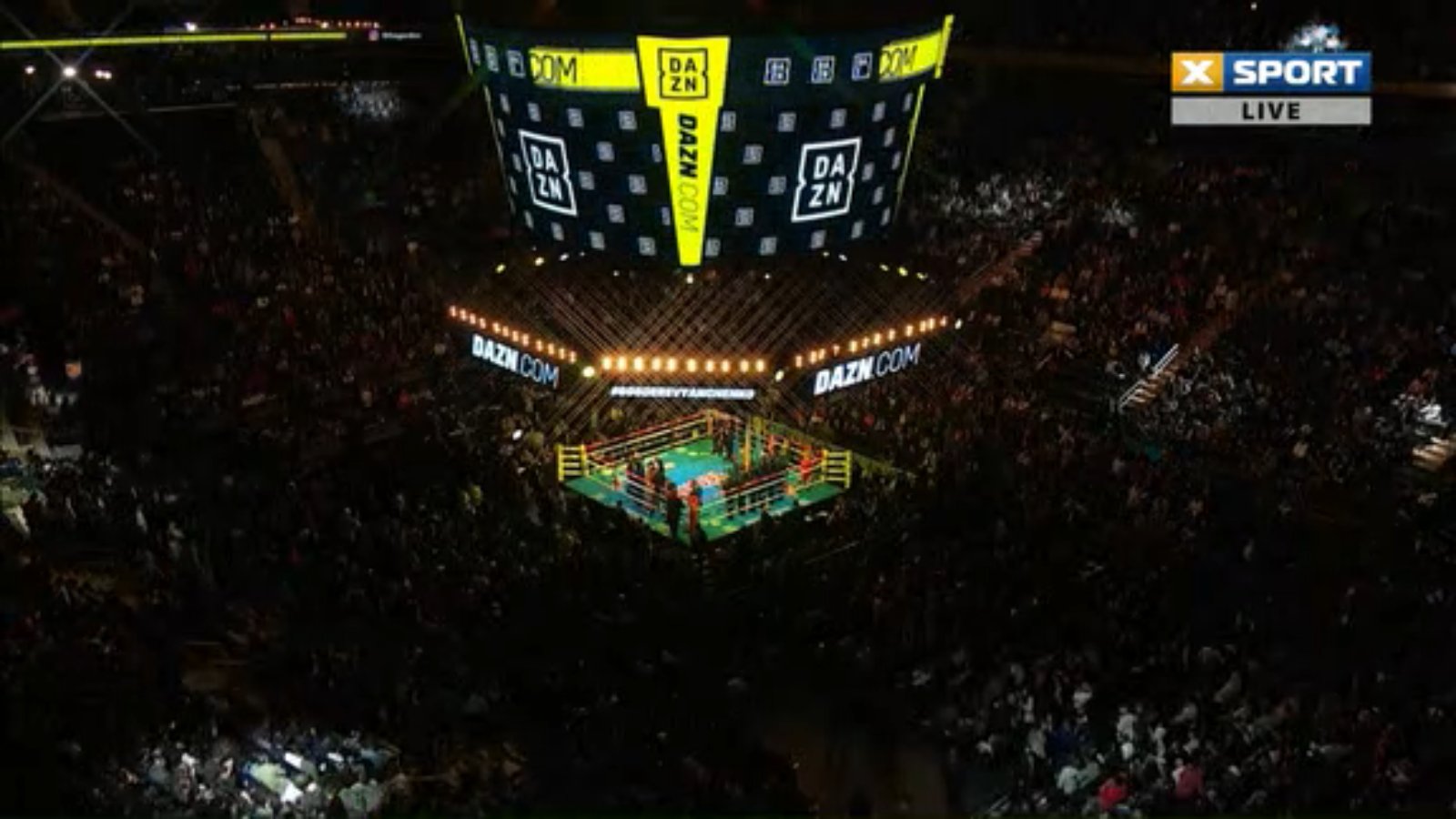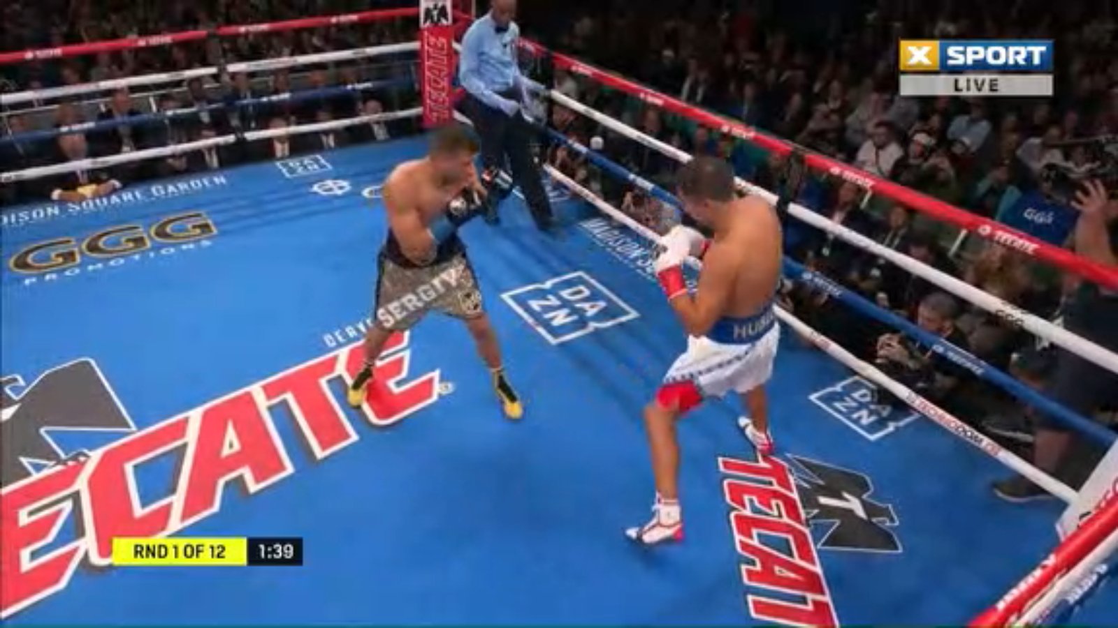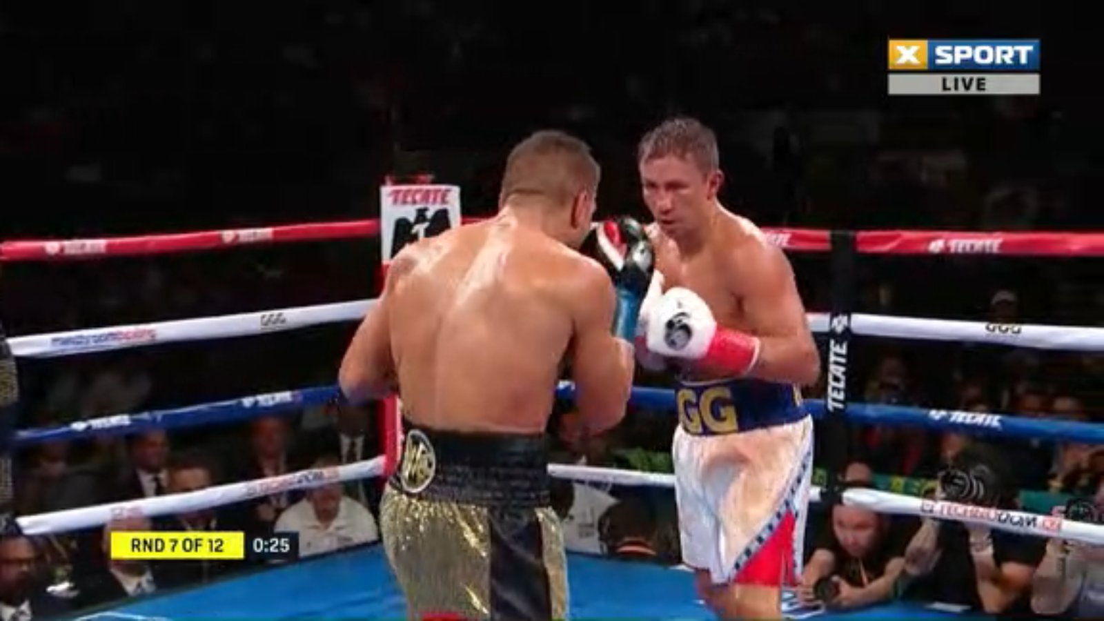 05:56. Головкин в белых шортах, Деревянченко в черно-золотых.