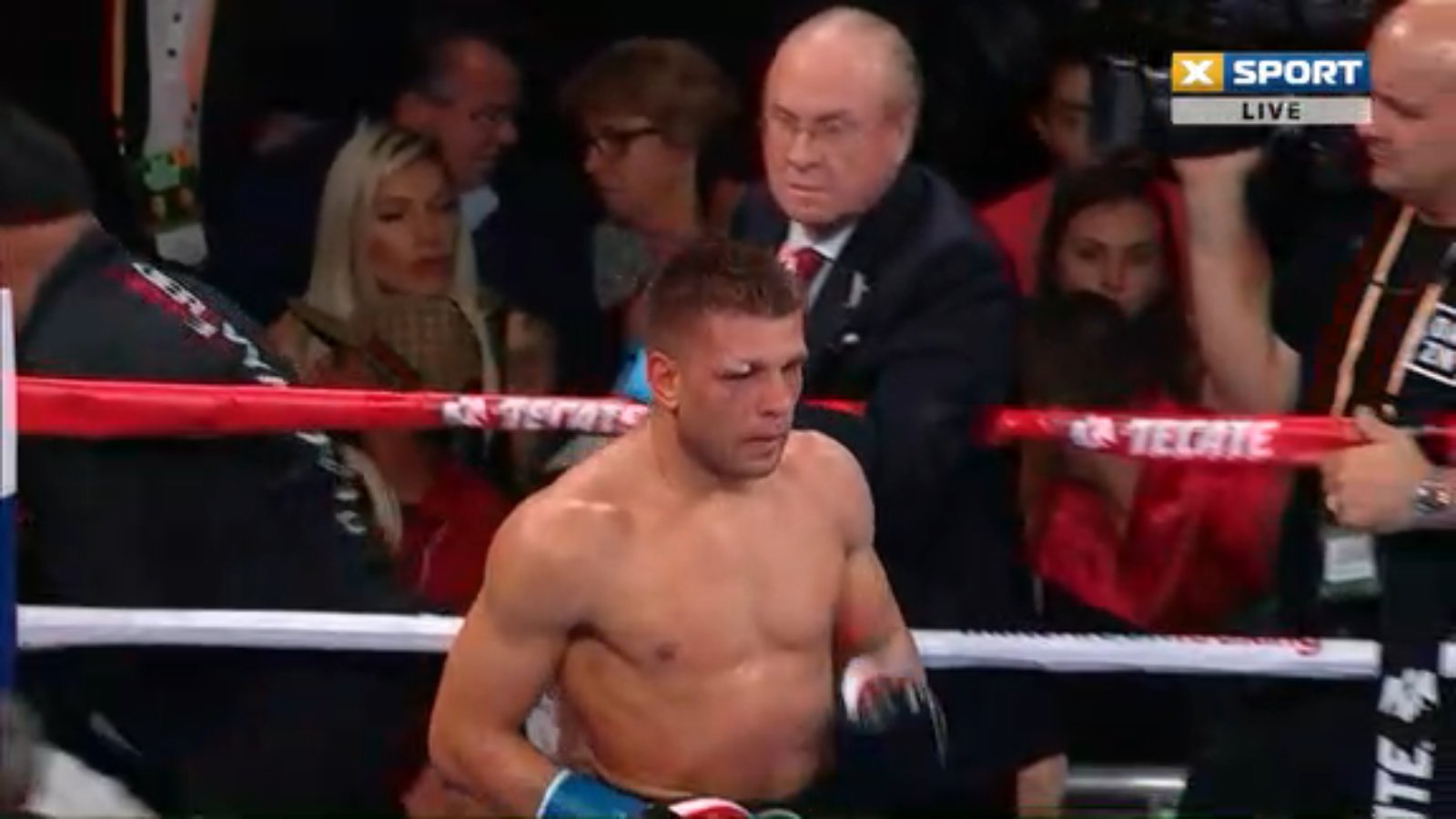 06:38. Неплохая серия от Сергея прошла. Встречает он соперника четко. А рана снова кровоточит.
