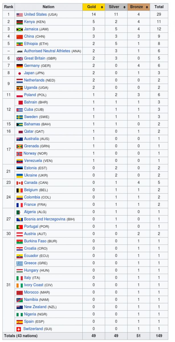 Больше всех медалей завоевала сборная США, с большим отрывом от всех соперников. В топ-5 лидеров медальной таблицы также вошли сборные Кении, Ямайки, Китая и Эфиопии.
