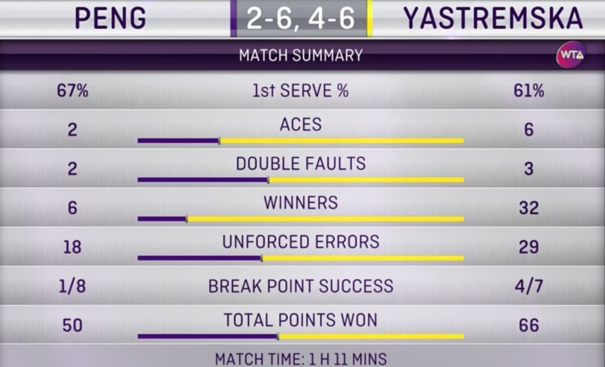 В целом, у китаянки как для двух сетов было довольно много шансов на брейк, но реализовать брейкпоинт удалось лишь раз во втором сете, когда Пэн Шуай единственный раз в матче выиграла более одного гейма подряд. У Даяны с этим проблем не возникало, на приеме она действовала намного успешнее противницы. Пока что путь Ястремской на турнире схож с победными турнирами аналогичной категории, но далее соперницы будут сложнее.