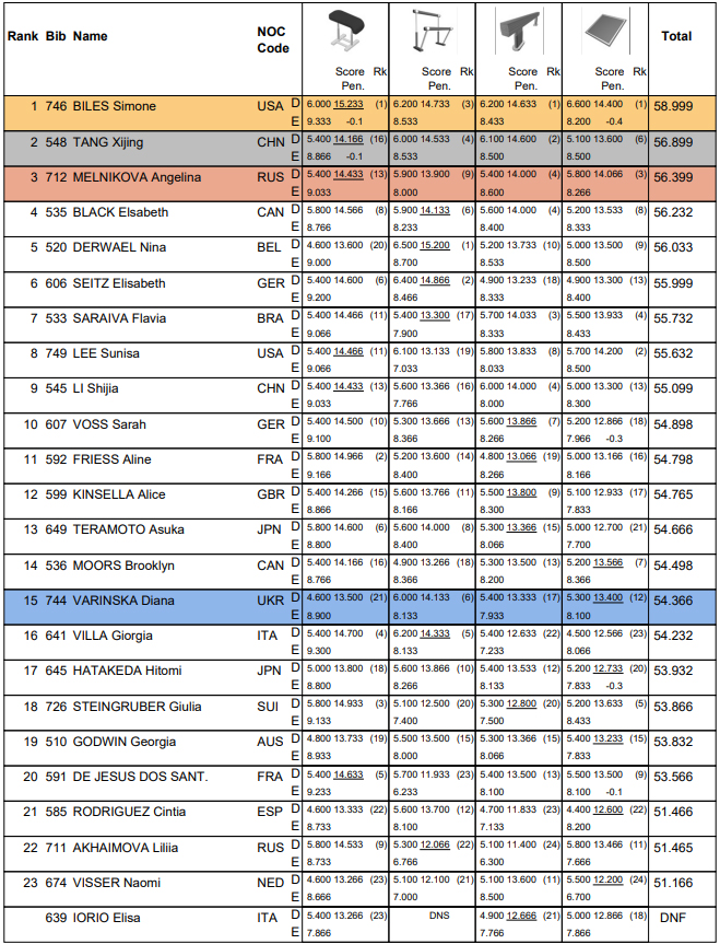 Диана Варинская выступила значительно лучше, чем в квалификации, и набрала 54,366 балла – это ее лучший результат в многоборье в карьере на международных стартах (в квалификации было 52,899). В итоге это 15-й результат среди лучших 24-х гимнасток мира.