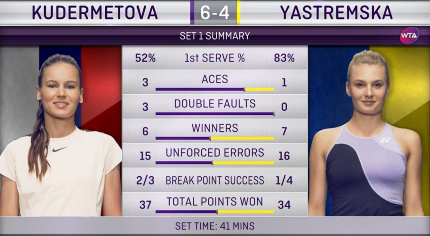 Стартовый отрезок первой партии более успешно провела россиянка. Нельзя сказать, что она играла намного лучше, но на важных мячах оказалась более стабильной. Также у Кудерметовой проходили эйсы на брейкпоинтах украини, где-то сама Даяна ошибалась в моментах, где этого можно было и не делать. Все шло к быстрому завершению первой партии, но Ястремская сумела навязать борьбу, легко выиграла 3 гейма подряд, после чего Веронике пришлось пообщаться с тренером.