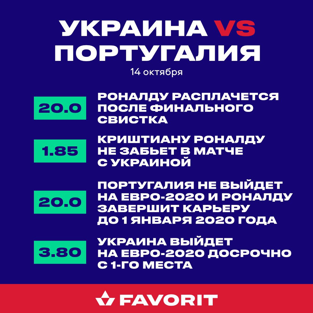 Португалия пока что тоже не обеспечила себе выход на Евро-2020 и поражение в Киеве может сильно пошатнуть шансы сборной. Если чемпионы не добудут заветную путевку и Роналду завершит карьеру до конца этого года, то это будет событием года в мире футбола и невероятной победа того, кто сделает на это свой прогноз, коэффициент – 20,0. А если же победа останется за сборной Украины, и она выйдет на чемпионат Европы с первого места в группе, то тут кэф 3,80, то есть, такой исход еще более вероятен.