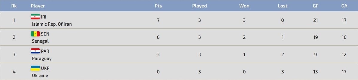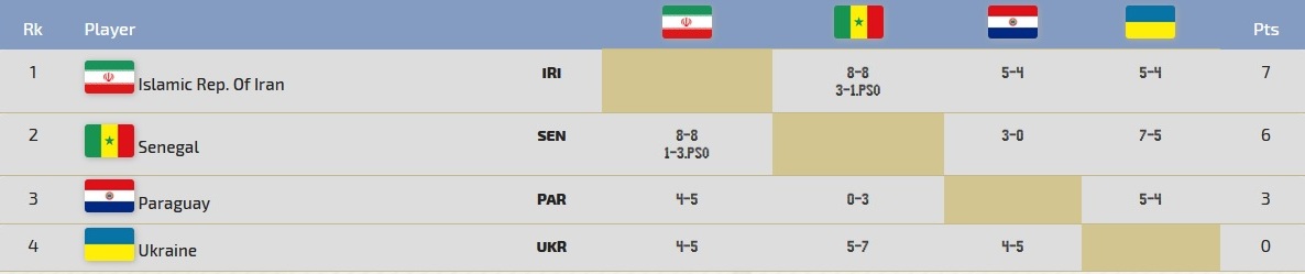 Таким образом, украинцы проиграли все три матча на турнире и остались на последнем месте группы С. А в плей-офф пробилась сборная Ирана, которая в заключительном поединке группового турнира одолела Парагвай со счетом 5:4.
