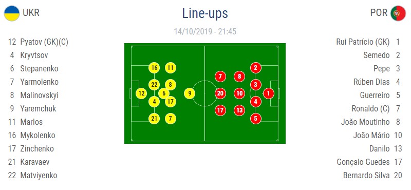 Португалия: Руй Патрисио – Семеду, Пепе, Рубен Диаш, Геррейру – Жоау Моутинью, Жоау Мариу, Данилу – Бернарду Силва, Гонсалу Гедеш, Криштиану Роналду.