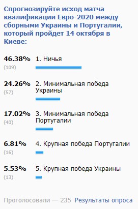 46.4% читателей Sport.ua прогнозируют ничью для Украины и Португалии