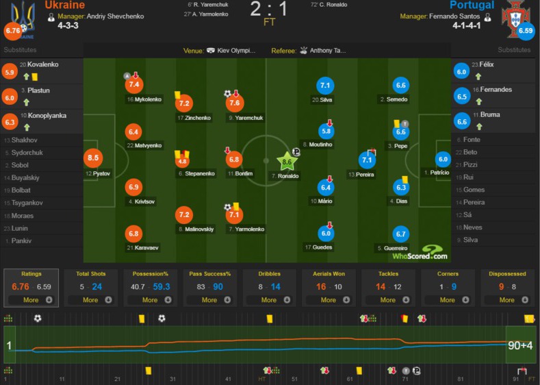 Лучшим игроком поединка Украина – Португалия стал лидер гостей Криштиану Роналду, который реализовал пенальти во втором тайме. 34-летний португалец получил оценку 8,6.