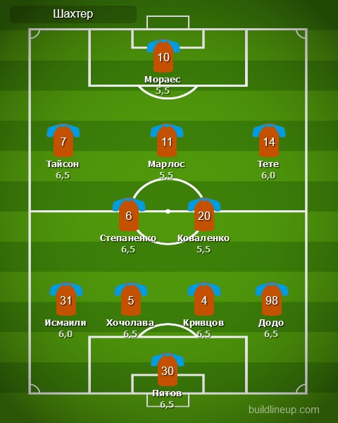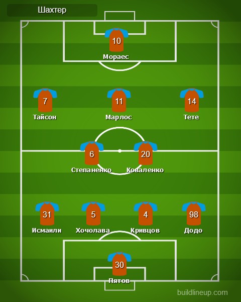 «Шахтер»: Андрей Пятов, Додо, Сергей Кривцов, Давид Хочолава, Исмаили, Тарас Степаненко, Виктор Коваленко (Алан Патрик, 59), Тете (Евгений Коноплянка, 59), Марлос (Манор Соломон, 74), Тайсон, Жуниор Мораес.