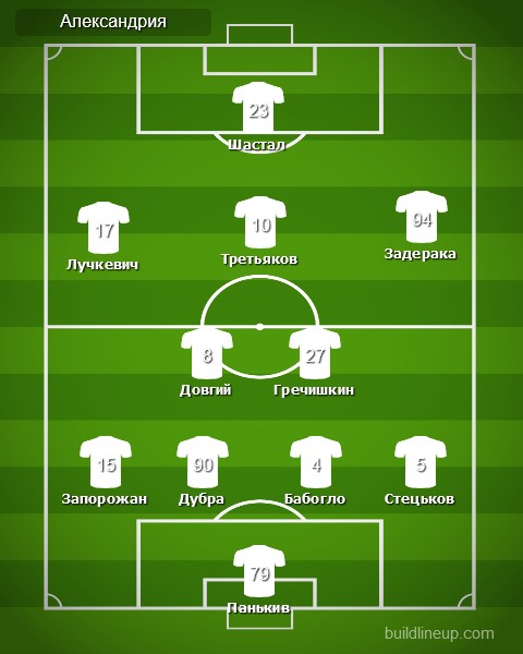 «Александрия»: Юрий Панькив, Алексей Довгий, Андрей Запорожан (Евгений Банада, 58), Каспарс Дубра, Максим Задерака (Павел Пашаев, 61), Дмитрий Гречишкин, Дмитрий Шастал, Владислав Бабогло, Валерий Лучкевич, Тимур Стецков, Максим Третьяков (Глеб Бухал, 90).