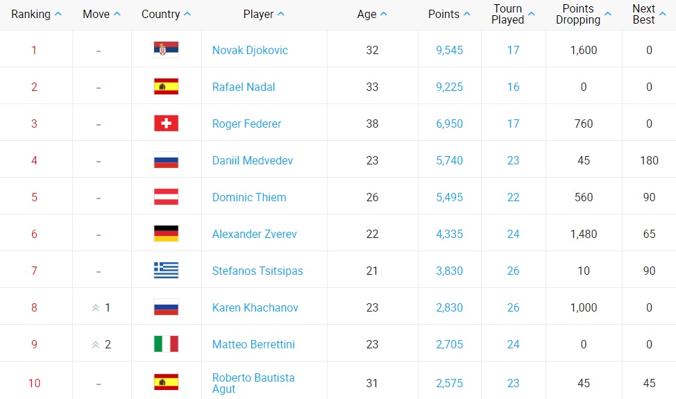 В обновленном рейтинге ATP произошло несколько изменений. Россиянин Карен Хачанов поднялся на 8-ю позицию. Также в 10-ку вошел Маттео Берреттини, который вытеснил из топ-10 Кеи Нисикоры, который теперь 11-й. Продолжает возглавлять мировой рейтинг Новак Джокович.