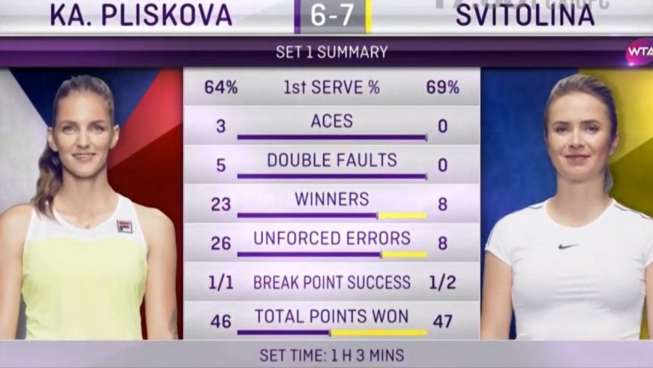 Первые два гейма остались за чешкой, но ситуация очень быстро выровнялась. После этого до конца сета ни одна из девушек не позволяла сопернице заработать ни одного брейкпоинта. В целом, игра была немного скучная для болельщиков: большинство розыгрышей были быстрыми, затяжной борьбы и смены ритма на корте практически не наблюдалось. Плишкова понимала, что ввязываться в борьбу характеров против Свитолиной дело неблагодарное, старалась сыграть точнее и острее, из-за чего часто допускала ошибки. Больше всего удивили пять двойных от чешки в первом сете, для нее это ужасный показатель, тем более только при трех эйсах.