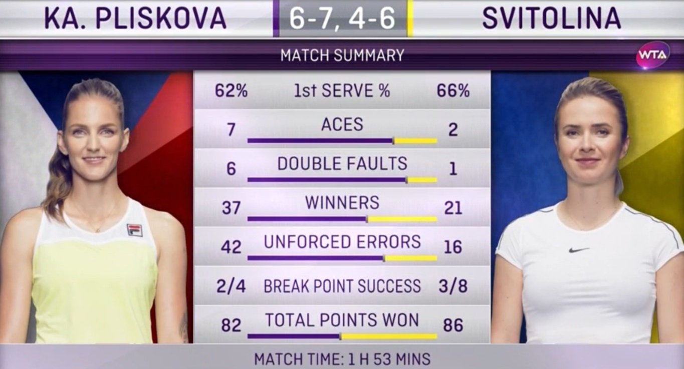 Сегодня мы увидели Свитолину, которая вышла побеждать за счет высокого класса, стабильности и преимущества в скорости. Украинка мало ошибалась, много двигалась, но редко рисковала. Плишкова вышла на матч не в лучших кондициях, но даже в такой форме она способна переиграть многих топовых теннисисток.