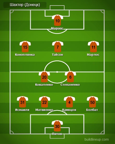 «Шахтер»: Андрей Пятов, Исмаили, Николай Матвиенко, Сергей Кривцов (Давид Хочолава, 46), Сергей Болбат (Додо, 53), Тарас Степаненко, Виктор Коваленко, Ромеро Марлос (Маркос Антонио, 100), Тайсон, Евгений Коноплянка (Дентиньо, 73), Жуниор Мораес