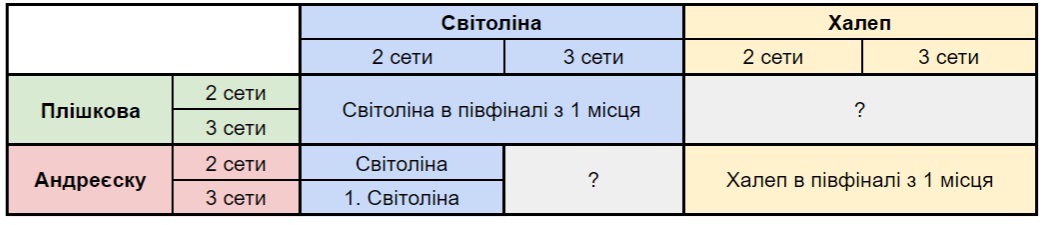 Також є стандартні варіанти, за яких учасниці першого матчу виграють обидва других поєдинки (наприклад, одночасні перемоги Світоліної і Плішкової або Халеп і Андреєску). В такому випадку тенісистка з двома очками автоматично в півфіналі з першого місця. Тому в паралельному матчі тримаємо кулаки за чешку.