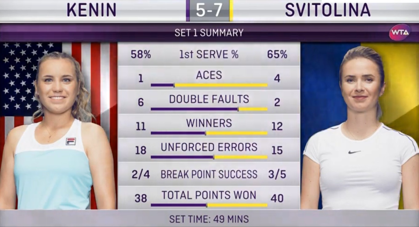 Сам тай-брейк по уровню напряженности был схож с матчем против Плишковой, числа также были двузначными. Элина первой дошла до матчболов, но реализовать свои возможности все никак не выходило. Были и ошибки со стороны украинки, и отличные удары американки. И все же, София устала первой, со счета 10-10 на тай-брейке именно две ее невынужденные ошибки решили исход этого поединка.