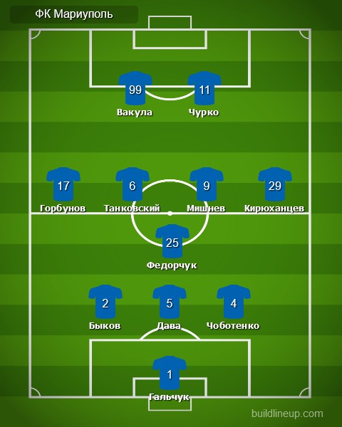 «Мариуполь»: Евгений Гальчук, Дава, Сергей Чоботенко, Алексей Быков, Игорь Кирюханцев, Валерий Федорчук, Дмитрий Мишнёв, Сергей Горбунов (Виктор Корниенко, 61), Вячеслав Танковский (Максим Чех, 15), Владислав Вакула (Дмитрий Топалов, 73), Вячеслав Чурко
