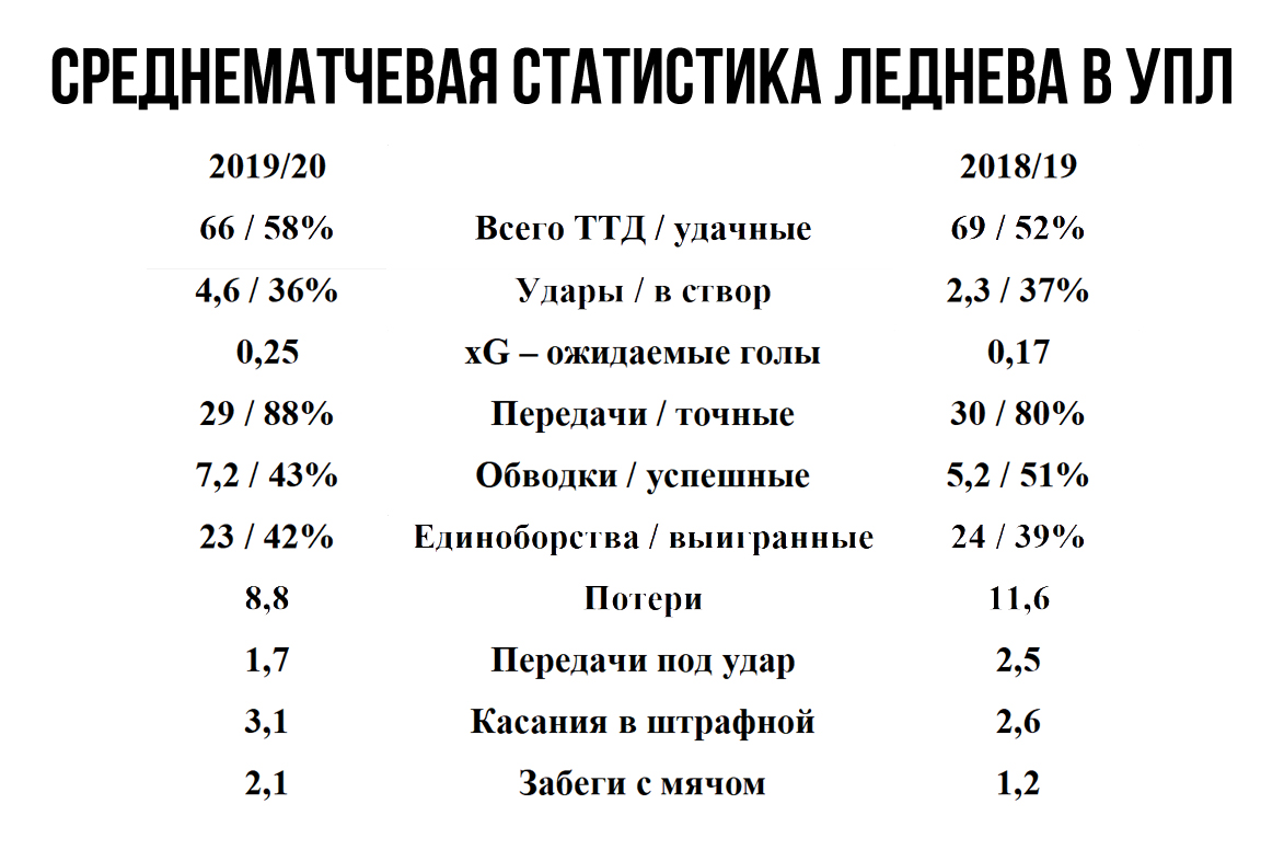 Впрочем, поговорим о более масштабных изменениях в игре Леднева, для чего привлечем «продвинутую» статистику от Wyscout. Сравнивать будем среднематчевые показатели игрока в минувшем и нынешнем розыгрышах УПЛ – так будет максимально корректно и правильно.
