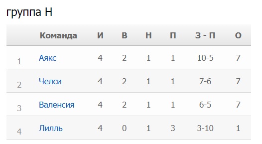 В группе H три из четырех команд забили по четыре гола. Матч «Челси» – «Аякс», который запомнился двумя удалениями и двумя автоголами, завершился со счетом 4:4.