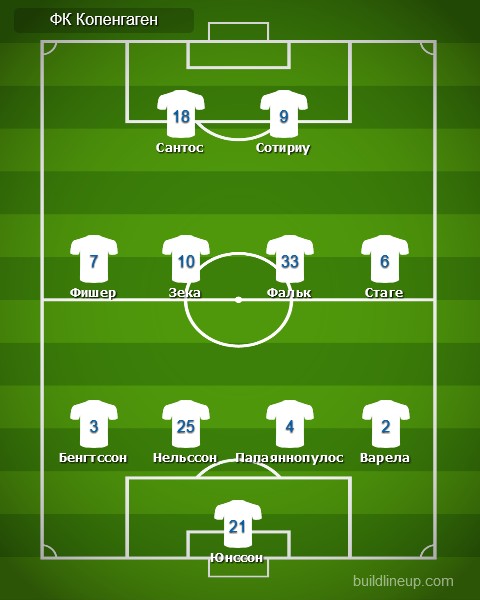 «Копенгаген»: Карл-Юхан Юнссон – Пьер Бенгтссон (Карло Бартолец, 69), Виктор Нельссон, Сотирис Папаяннопулос, Гильермо Варела – Виктор Фишер (Николай Томсен, 82), Карлос Зека, Расмус Фальк (Мохамед Дарами, 55), Йенс Стаге – Майкл Сантос, Пиерос Сотириу