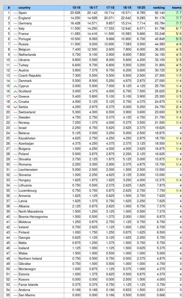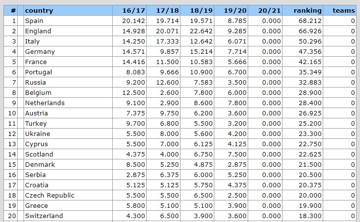 Таблица коэффициентов УЕФА 2020 (влияет на распределение путевок в сезоне 2021/22)