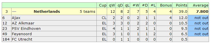 Нидерланды взяли чуть больше, 4 очка из 8 (победа «АЗ Алкмаар», ничьи «Аякса», «Фейеноорда», поражение ПСВ), что при делении на пять стартовавших клубов принесло 0.800 балла. Таким образом, отставание Украины от Нидерландов на этой евронеделе увеличилось с 0.850 до 1.050 балла. Голландские клубы проводят отличный евросезон (уступая по баллам лишь Англии и Испании, у которых 9.285 и 8.785 соответственно) и уже имеют 39 очков / 5 команд = 7.800.