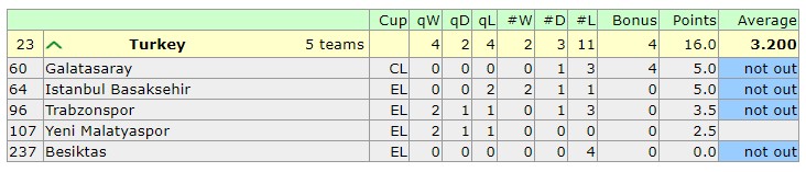 Турция за неделю добавила в копилку всего 2 очка из 8 (победа «Истанбула Башакшехир», поражения «Галатасарая», Трабзонспора» и «Бешикташа»), при пятерых стартовавших клубах это им принесло лишь 0.400 балла. Получается, отрыв Украины от Турции за неделю вырос на 0.200 и теперь составляет 1.300. За сезон Турция имеет всего лишь 16 очков / 5 команд = 3.200.