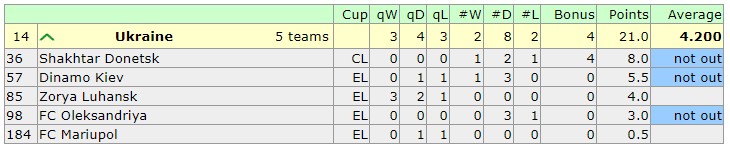В таблице коэффициентов Украина продолжает удерживать 10-ю позицию, находясь между Нидерландами и Турцией. За прошедшую евронеделю Украина получила в таблицу коэффициентов УЕФА 3 очка из 6 возможных, так как все три клуба («Шахтер», «Динамо» и «Александрия») сыграли вничью. При делении на 5 клубов прибавка в еврокопилку получилась 0.600 балла, а в сезоне теперь имеем 14 место, набрав 21 очко / 5 команд = 4.200.