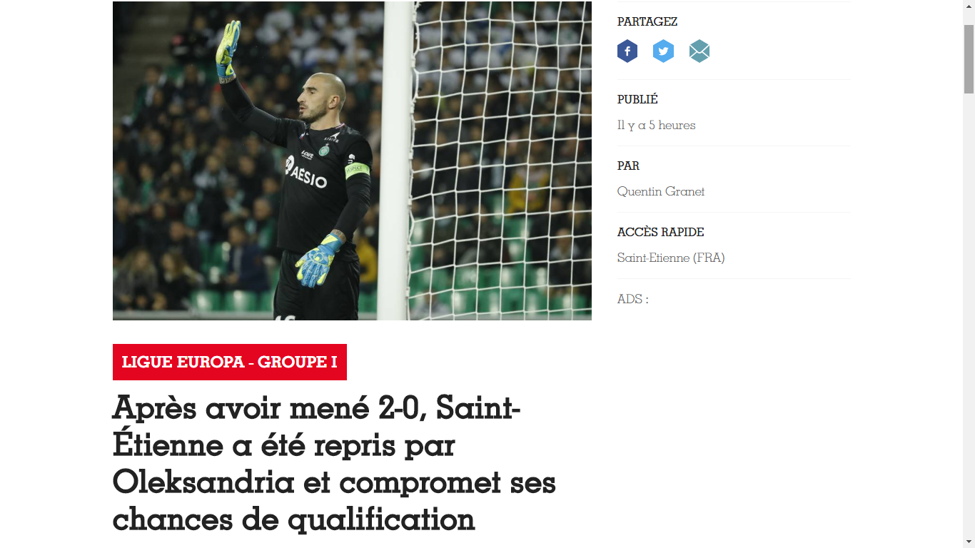«Сент-Этьен» упустил победу на последних минутах матча с «Александрией» в Украине. Несмотря на вторую ничью против скромной украинской команды, «зеленые» все еще могут надеяться на выход в 1/16 финала Лиги Европы. «Сент-Этьен» и «Александрия» набрали по три очка в группе I и находятся в зоне вылета. Второй в группе «Вольфсбург», в активе которого после поражения от «Гента» пять баллов».