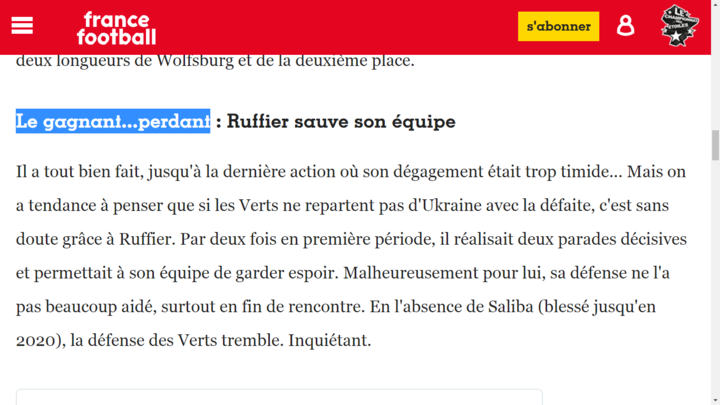 «Победитель...неудачник. Руфье делал все правильно, до последнего действия, когда слишком небрежно выбил мяч при выходе из ворот. Но мы склонны думать, что зеленые покинули Украину не с поражением именно благодаря Руфье. В первом тайме он сделал два решающих парирования и позволил своей команде сохранить надежду. К сожалению для него, его защита не сильно помогла, особенно в конце игры».