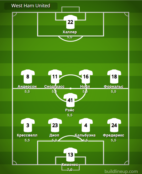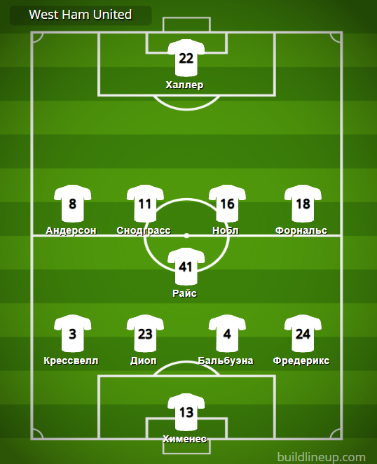 Вест Хэм: Хименес – Крессвелл, Диоп, Бальбуэна, Фредерикс – Райс – Фелипе Андерсон (Ланцини, 58), Снодграсс, Нобл (Ярмоленко, 20), Форнальс (Айети, 64) – Халлер.