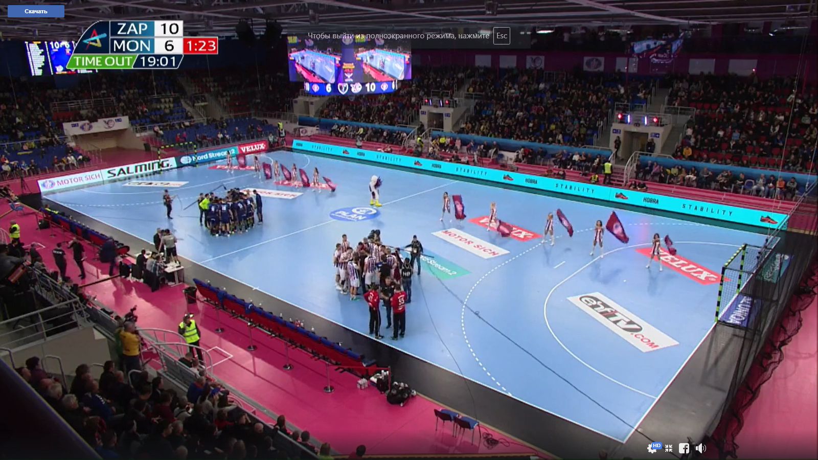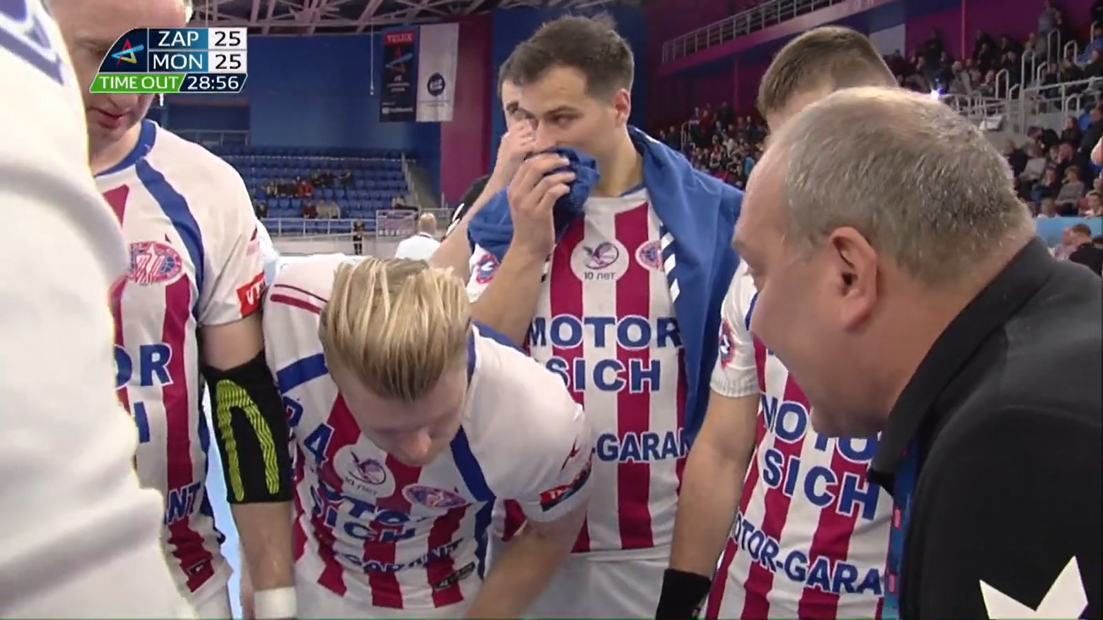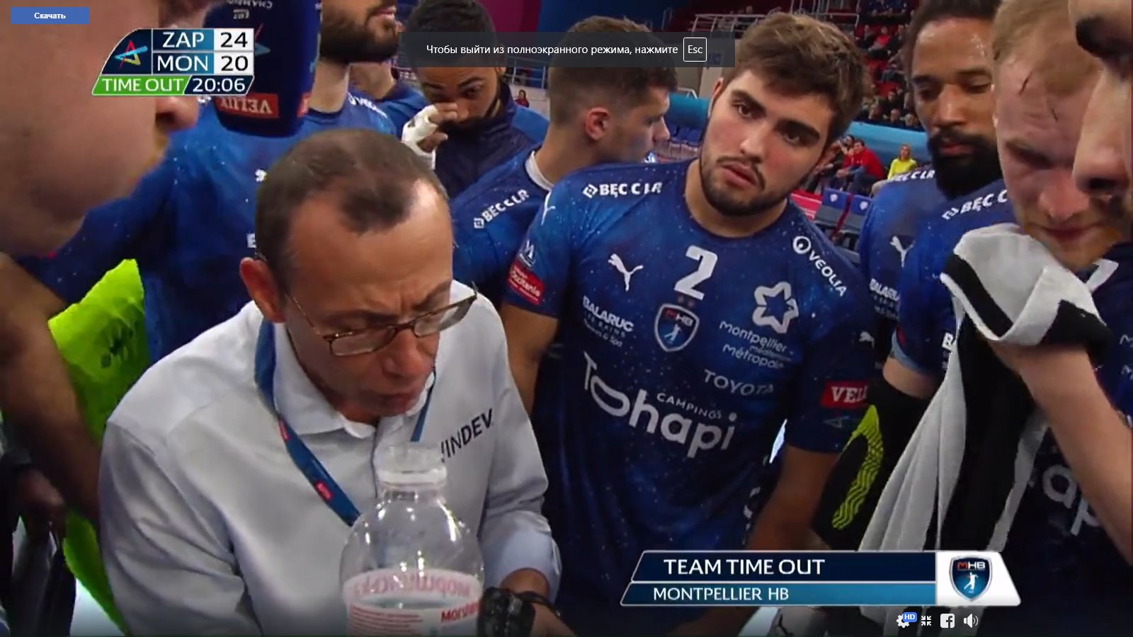 25:25. В воротах Комок. Затяжная атака Монпелье. И их тренер берет тайм-аут. И Степанец дает указания